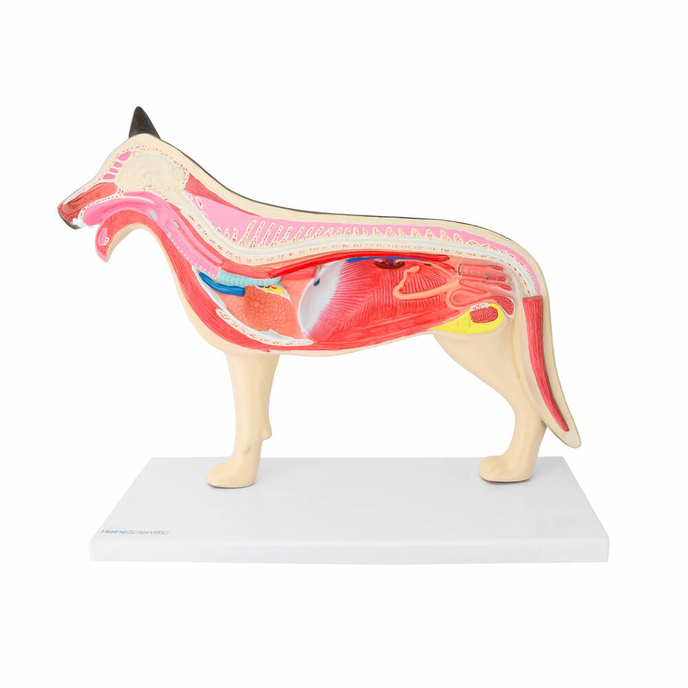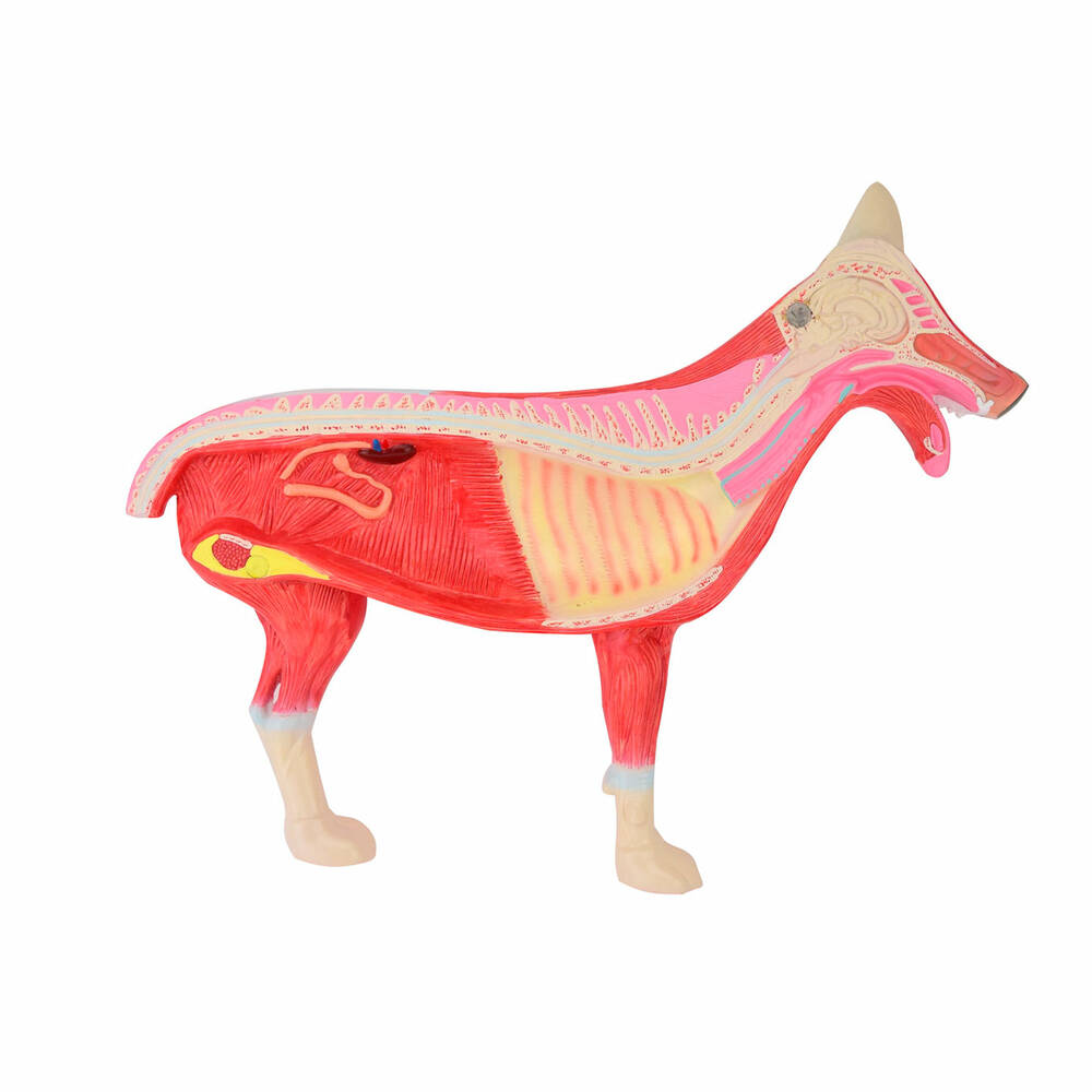 Анатомічна модель собаки в розрізі є детальною ілюстрацією зовнішніх та внутрішніх тканин та внутрішніх органів тварини. Призначена для дослідження та вивчення структури тіла собаки. Модель дозволяє бачити внутрішні органи собаки, шари зовнішніх тканин, що може бути корисно для ветеринарних студентів, ветеринарів, дослідників та інших професіоналів, які працюють з собаками.