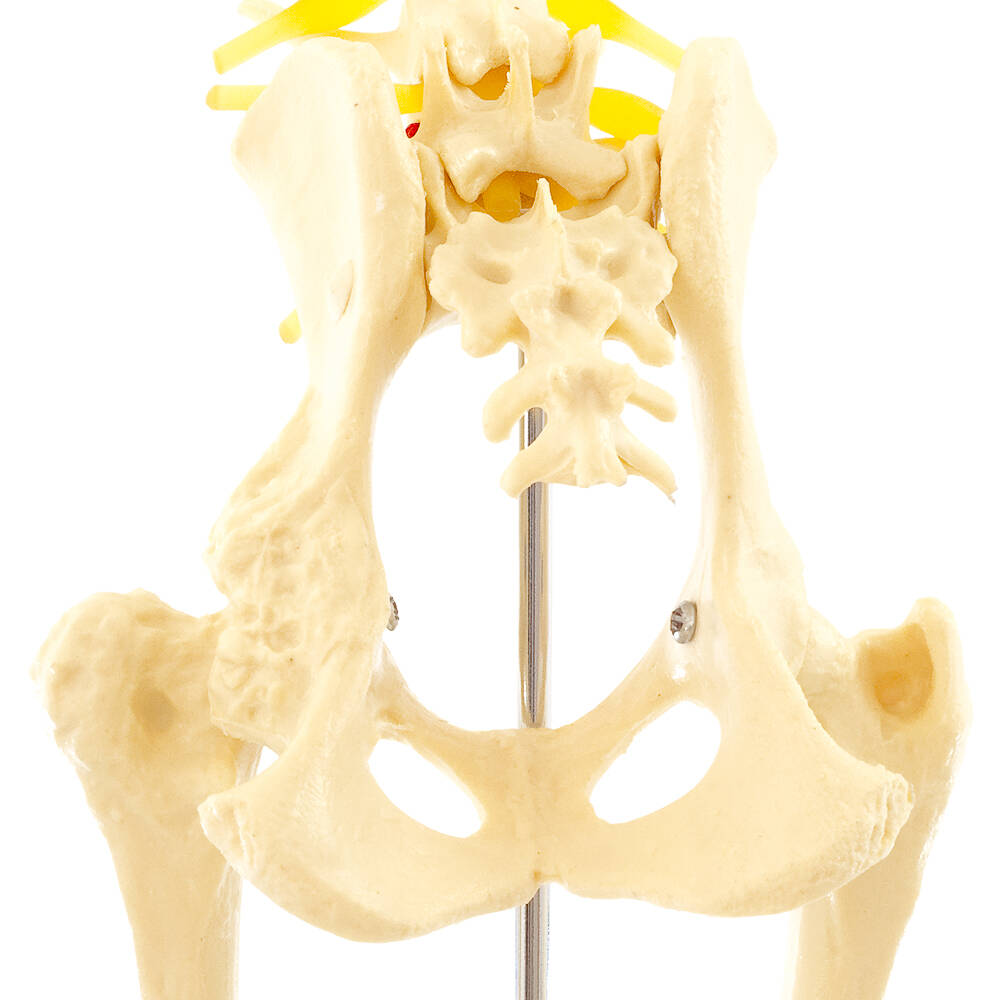 Анатомічна модель стегна собаки демонструє здорову та уражену артритом кістку стегна. Скелетна модель відповідає за масштабом стегну собаки середнього розміру. Конструкція встановлена на білій пластиковій основі за допомогою металевого тримача.