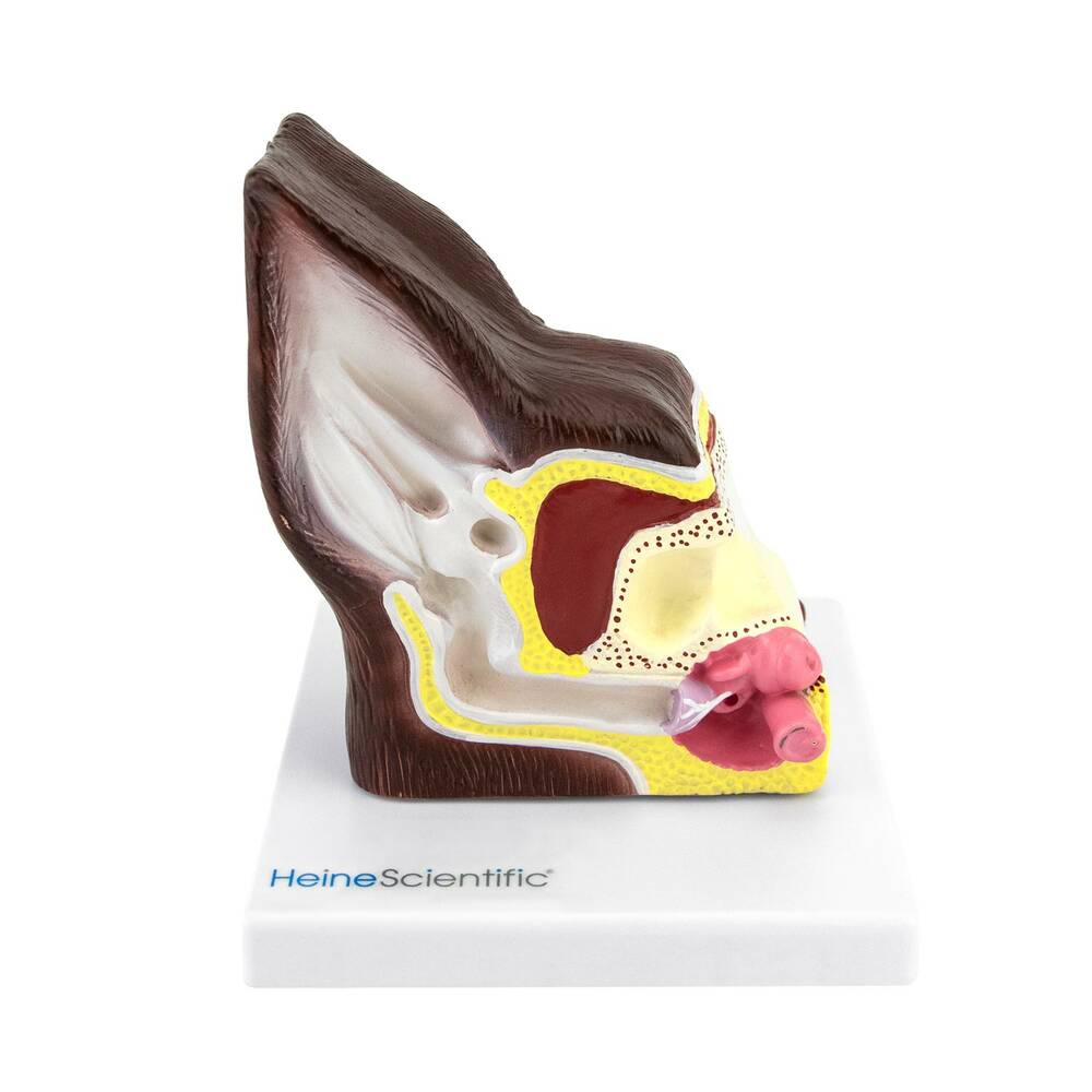 На одній стороні зображено здорове вухо собаки, а на протилежній стороні — хворе вухо. Кольорова модель вуха HeineScientific підходить для демонстрації фізіологічних структур та патологічних змін вуха собаки. Вона полегшує консультацію власника тварини і, таким чином, сприяє успіху подальшого лікування.