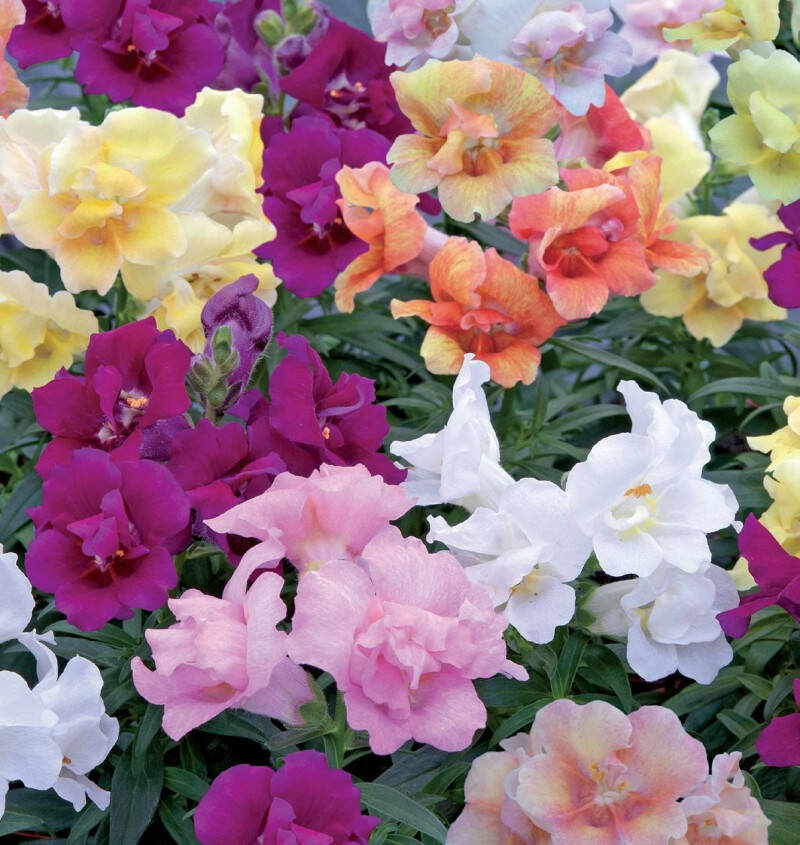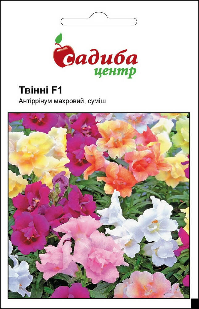 Антірінум Твінні F1, суміш - низькоросла, однорічна рослина. Це новий карликовий гібрид з подвійними квітками і розгалуженими кущами. Висота рослини у відкритому грунті 25 - 30 см, у горщику -10 - 15 см, а діаметр - 20 - 25 см. Квітки пишні, напівмахрові, зібрані в суцвіття. Насіння на розсаду висівають в середині березня під плівку або скло в горщики. Загартовану розсаду висаджують у другій декаді травня на відстані 15 - 50 см. Цвітіння починається рано і триває з червня до заморозків. Рослина стійка до несприятливих умов вирощування. Для того щоб продовжити період декоративності, необхідно регулярно видаляти відцвілі суцвіття. Відмінно підходить для озеленення. Ефектно буде виглядати в горщиках, підвісних корзинах, контейнерах , а також в клумбах і квітниках.