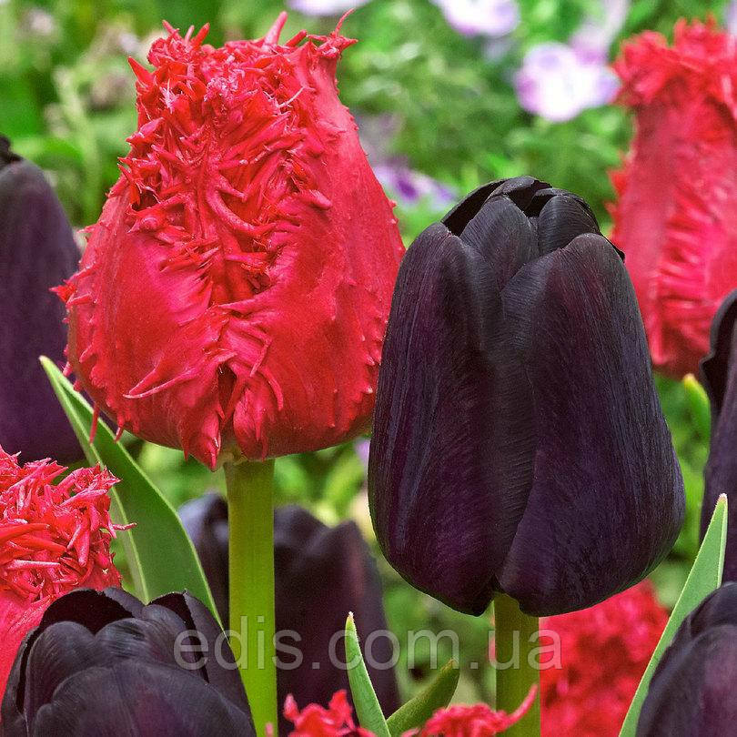 Основний, безперечно, – червоний оторочений тюльпан. Підібраний відтінок "багатий", глибокий вишнево-червоний, чудна бахрома посилює ефект.