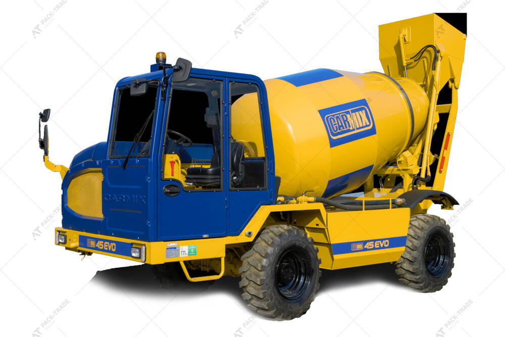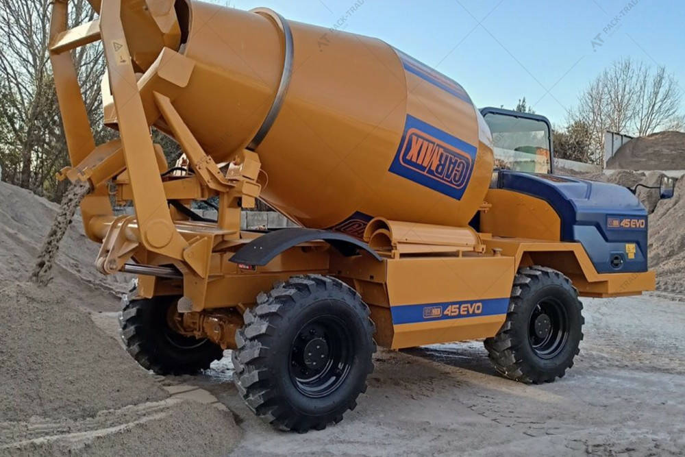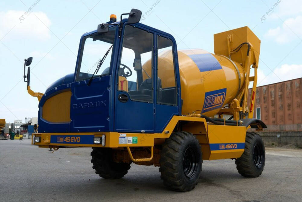 Автобетонозмішувач Carmix 45EVO — самохідний бетонозавод підвищеної потужності, здатний ефективно працювати в умовах бездоріжжя та обмеженого доступу. Барабан об’ємом 6 050 літрів і завантажувальний ківш на 600 літрів з гідравлічним затвором забезпечують повноцінний цикл змішування бетону без залучення додаткового обладнання. Машина оснащена електричним сервокеруванням, розвиває швидкість до 9 км/год під час роботи та до 25 км/год під час пересування. Для захисту оператора система оснащена зворотними й запобіжними клапанами, що контролюють робочий тиск і запобігають аваріям.