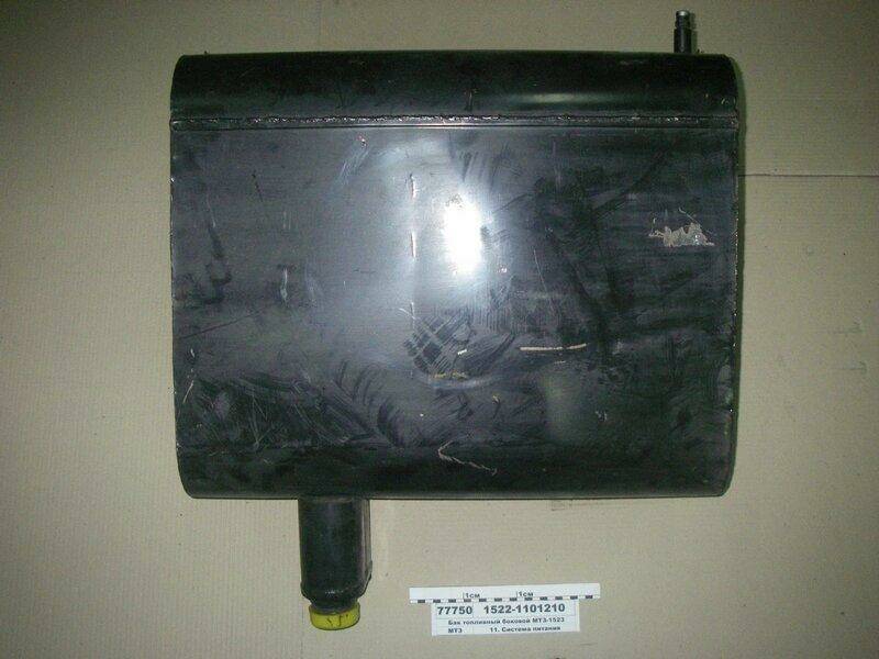 Бак топливный дополнительный, устанавливается на тракторах МТЗ-1221, 1523, оригинальный, производства ОАО 'Минский тракторный завод', ОАО 'МТЗ', г. Минск, Республика Беларусь Топливный бак (бензобак) — ёмкость для хранения запаса жидкого топлива (бензин, керосин, дизельное топливо) непосредственно на борту транспортного средства или технического устройства, получающего энергию от жидкотопливного двигателя внутреннего сгорания.Также топливные баки (ёмкости) для дизельного топлива используются в системах автономного отопления — для обеспечения топливом дизельных отопительных котлов. Топливный бак, установленный на борту транспортного средства, состоит из герметичного корпуса с имеющейся на его поверхности заливной горловиной, снабжённой запорной крышкой. Также на корпусе топливного бака в случае необходимости располагается отверстие для введения датчиков контроля уровня топлива, или его давления. Топливные баки также могут иметь сливное отверстие, снабжаемое запорной пробкой или краником (например, на тепловозах). Баки, используемые для обеспечения отопительных котлов, представляют собой герметичные пластиковые ёмкости сферической, кубической или прямоугольной формы, имеющие входное отверстие в верхней части, объёмом 500, 750, 800, 1000, 1100, 1500, 2000 литров (возможны и другие размеры, указанные являются наиболее востребованными). Бак соединяется с отопительным котлом медной трубой при помощи специального фиксирующего пакета, состоящего из прибора для измерения уровня топлива в баке, шланга с топливозаборником, аэратора и деталей крепежа. В систему обеспечения топливом одного котла может входить несколько топливных баков разной ёмкости, которые соединяются между собой посредством дополнительных фиксирующих пакетов.