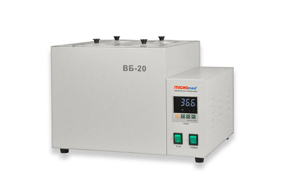 Баня водяна ВБ-20 MICROmed - сучасний лабораторний апарат, завдання якого полягає в нагріванні і підтримці стабільної температури проб і зразків під час виконання досліджень і проведення аналізів. Широко використовується для термостатування біологічного матеріалу в стоматології, хірургії, науково-дослідних, ветеринарних і промислових лабораторіях та інших областях. Водяна баня ВБ-20 4-місна, також має назву термостат рідинний.