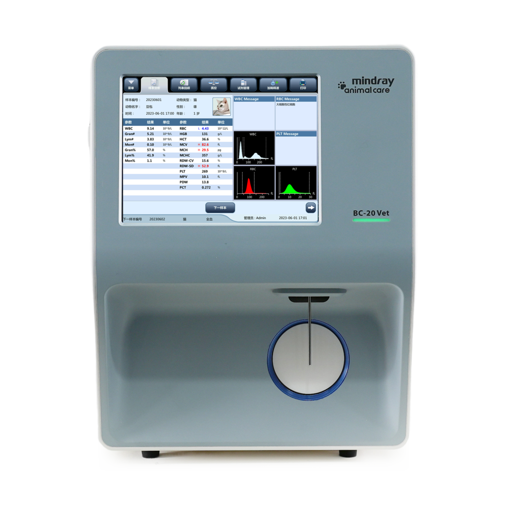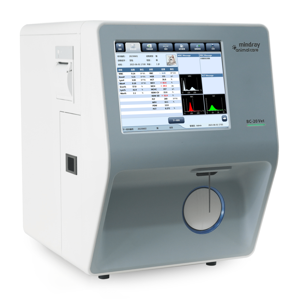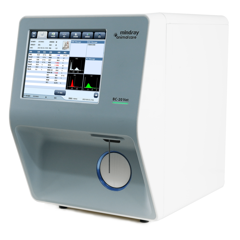 Гематологічний аналізатор BC-20 Vet від всесвітньо відомого виробника Mindray являє собою інноваційний гематологічний аналізатор, що є наступником моделі ВС-2800 Vet. Модель призначена для визначення 21 параметру (P-LCR, P-LCC) та побудови гістограм розподілу. Даний аналізатор так само як і його попередник використовує два незалежних принципи вимірювання: метод Култера і колометричний метод. Зменшена кількість досліджуваного зразка цільної крові, в цій моделі її об'єм становить всього 9 мкл. Під час кожного вимірювального циклу зразок автоматично аспірується, розбавляється і перемішується перед визначенням кожного параметра, що робить гематологічний аналізатор BC-20 Vet зручним у використанні навіть для користувачів-початківців. 8,4-дюймовий сенсорний екран відображає стан приладу, вимірювання та графіки, також з його допомогою здійснюється управління аналізатором.