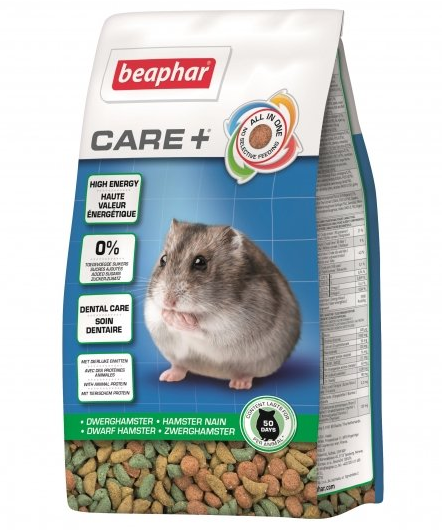 Повноцінний екструдований корм супер-преміум класу для джунгарських хом’яків CARE + містить тваринні білки і високий вміст жиру, щоб забезпечити енергетичні потреби хом’яків. Гранули мають особливу форму, яка дозволяє хом’якам зберігати корм в защічних мішках. Кожна гранула має однаковий склад («все-в-одному») для збалансованого харчування і запобігання вибіркового поїдання без залишку. Система (Dental Care) для сточування зубів.