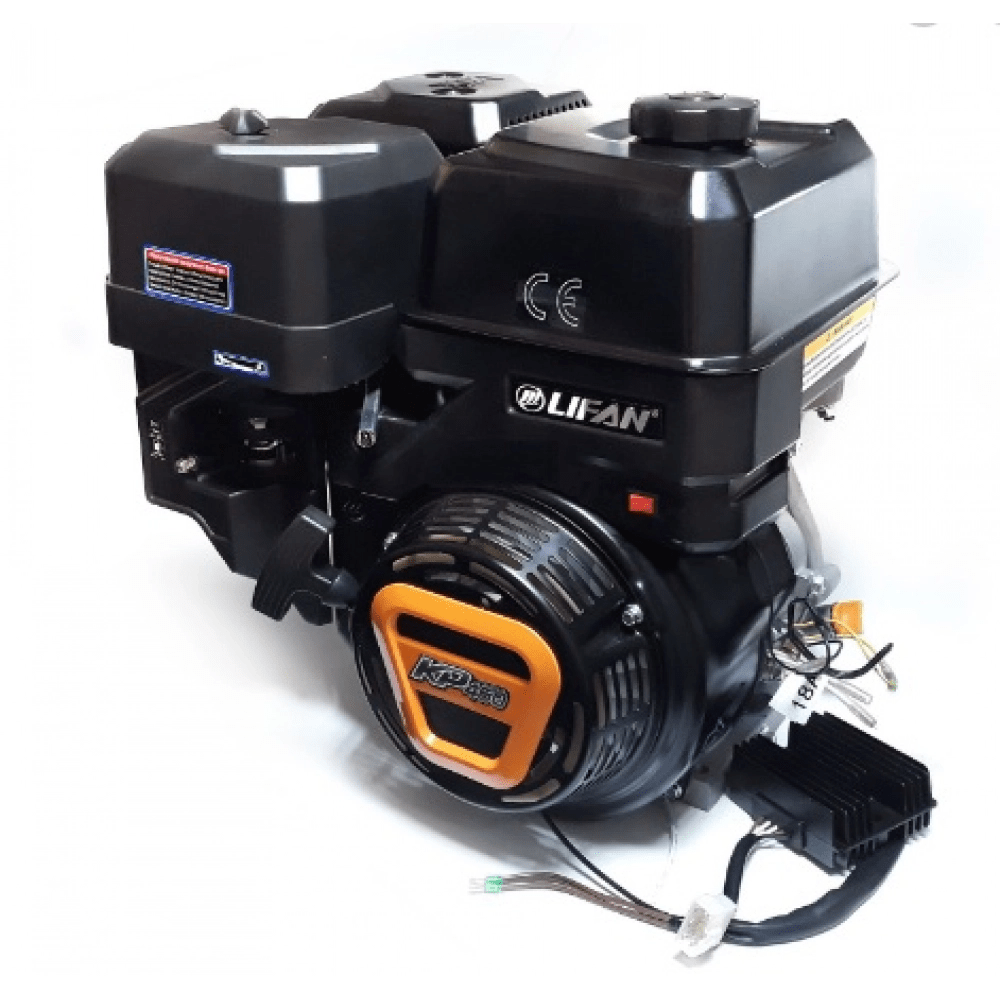 Двигун Lifan KP460E  це 4-х тактний одноциліндровий бензиновий двигун з примусовим повітряним охолодженням та горизонтальним розташуванням валу відбору потужності, що обертається проти годинникової стрілки.