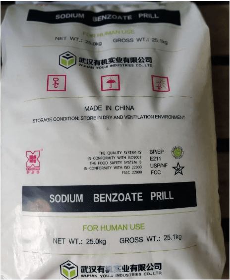 Бензоат натрію (Е211) називають речовину, що має властивості консерванту. Являє собою білий порошок без смаку і запаху. Бензоат натрію — натрієва сіль бензойної кислоти.