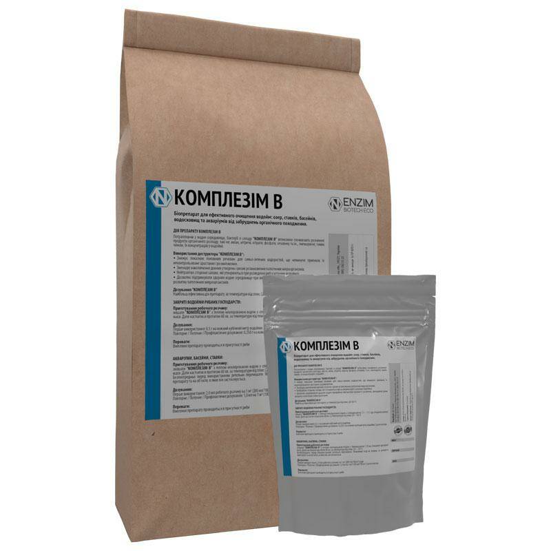 Біодеструктор Комплезім В - біопрепарат для ефективного очищення водойм: озер, ставків, водосховищ, басейнів та акваріумів від забруднень органічного походження, для зменшення вмісту органічних речовин, розчинених у воді, різноманітних сполук азоту, за рахунок чого у воді зменшується вміст метану, сірководню тощо.