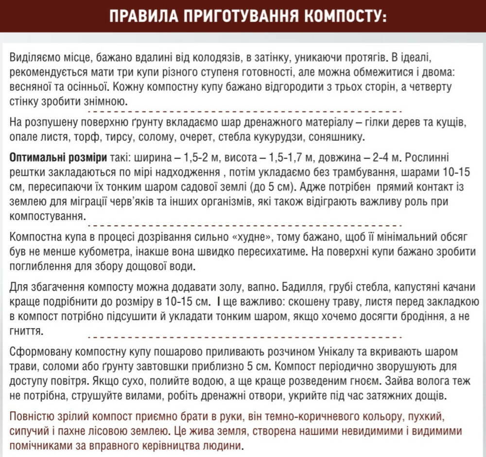 • Для обработки 3 - 4 м3 отходов необходимо размешать 30 г биопрепарата Уникал в 10 - 30 л теплой нехлорированной (отстоянной) воды, настоять 30 минут, помешивая. Перед обработкой отходы должны быть увлажнены (водой, дождем) до состояния выделения влаги при среднем нажатии. Каждый слой отходов высотой 20 см равномерно полить раствором биопрепарата, сверху поверхность прикрыть травой, соломой или почвой.