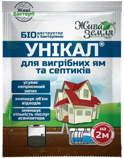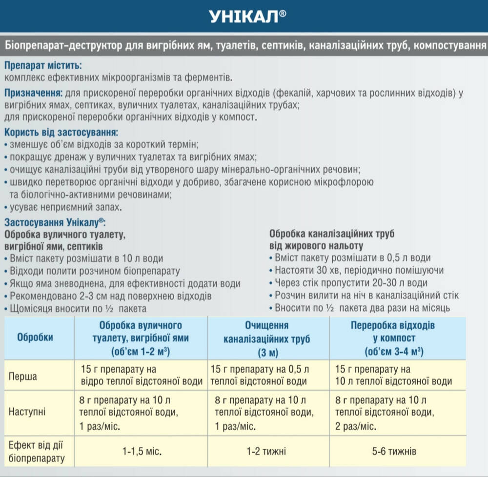 15 г биопрепарата Уникал размешать в ведре теплой (25-30)С нехлорированной (отстоянной) воды. Для активации полезной микрофлоры раствор биопрепарата настоять в затененном месте 30 минут при периодическом перемешивании. Содержимое уличного туалета, выгребной ямы или септика (1-2 м3) равномерно полить раствором биопрепарата. При необходимости можно добавить еще теплой нехлорированной воды, чтобы уровень жидкости над поверхностью отходов был не менее 2-3 см. Через 1-1,5 месяца в уличном туалете и выгребной яме улучшается дренаж, уменьшается объем отходов, благодаря переработке их микроорганизмами и ферментами, входящими в состав Уникала, в экологически безопасную жидкость. Для продления срока действия выгребной ямы, уличного туалета, уменьшение до минимума количества услуг ассенизаторской машины, исчезновение неприятного запаха, рекомендуется ежемесячно вносить биопрепарат Уникал по ½ пакета в виде раствора, приготовленного, как указано выше. Следить за уровнем жидкости над поверхностью отходов! Уникал работает в интервале температур от 0 до 40С, оптимум действия - (25-35)С.