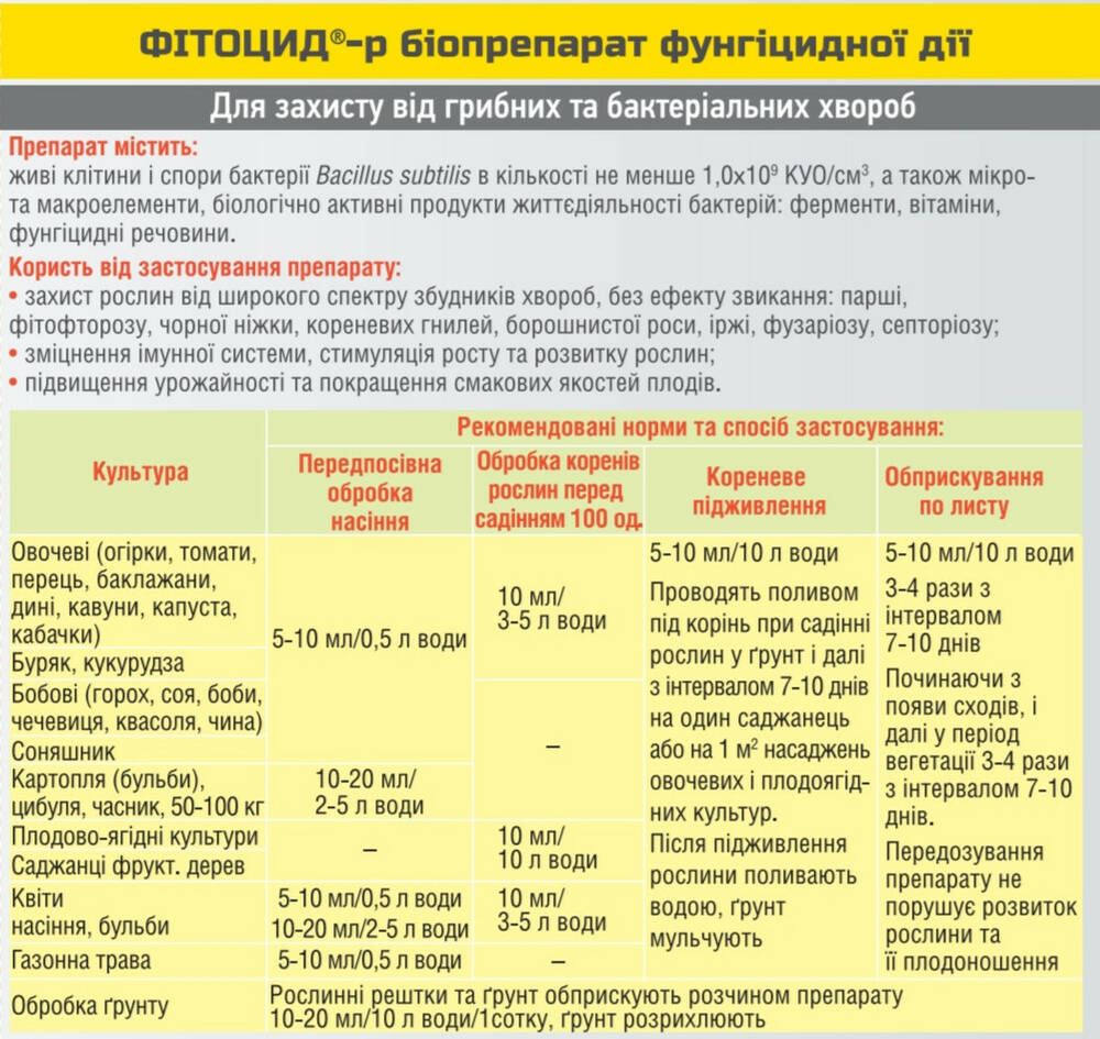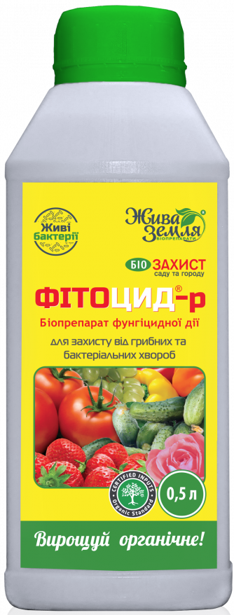 Фитоцид-р - биопрепарат фунгицидного действия, для защиты комнатных и садовых растений от грибных и бактериальных болезней. Имеет антимикробные и ростостимулирующие свойства, основанные на способности микроорганизмов Bacillus subtilis активно заселять все ткани растений, противодействуя проникновению возбудителей болезней в растение, продуцировать антимикробные вещества и метаболиты, которые принимают участие в преобразовании сложных органических и минеральных соединений почвы на доступные для растений формы: гумус, фосфор, азот и т.д.