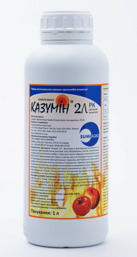 Механізм дії: системний бактерицидний фунгіцид лікувальної дії, основною сферою застосування якого є лікування бактеріозів викликаних бактеріями Erwinia, Pseudomonas, Xantomonas. Казумін впливає на проліферацію (поділ та розмноження) клітин бактерій зупиняючи синтез білку, впливає на РНК, в результаті чого зупиняється ріст і розмноження бактерій.