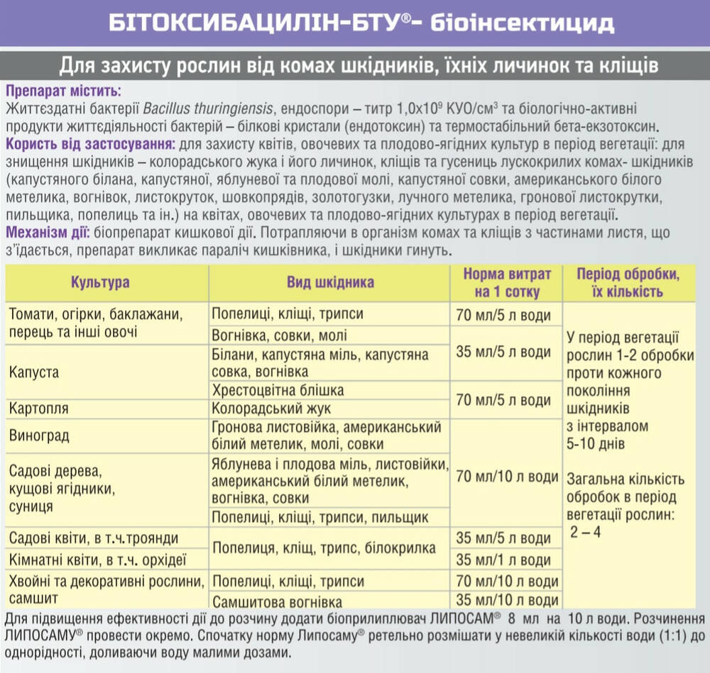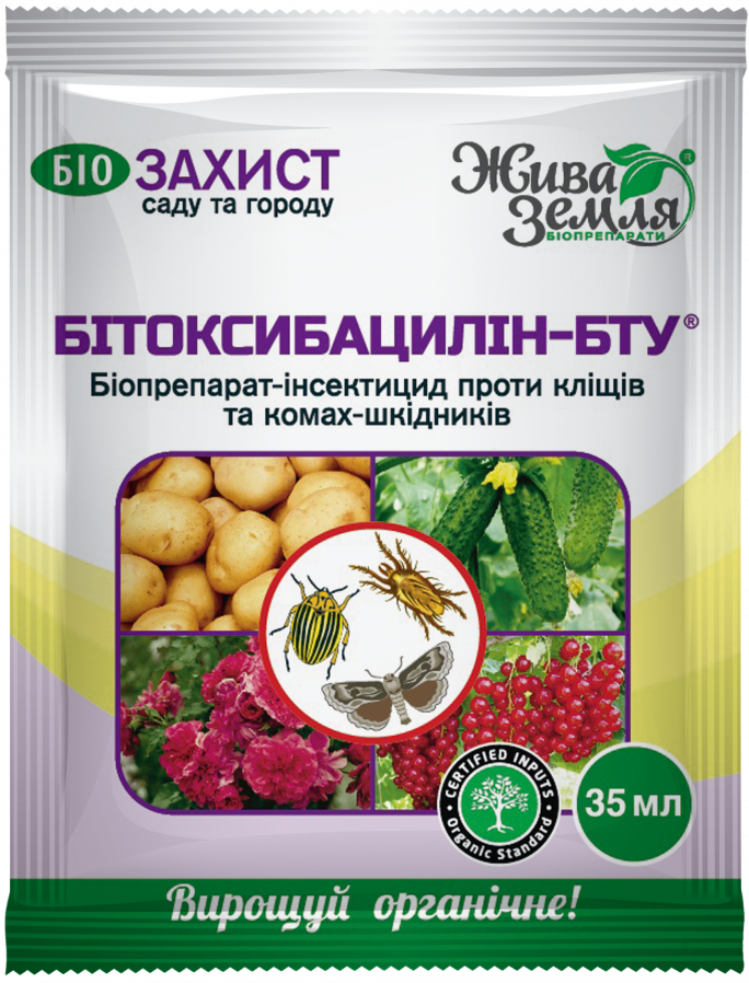 Битоксибацилин-БТУ - биопрепарат-инсектицид для защиты цветов, овощных и плодово-ягодных культур для защиты растений от насекомых-вредителей, их личинок и клещей.