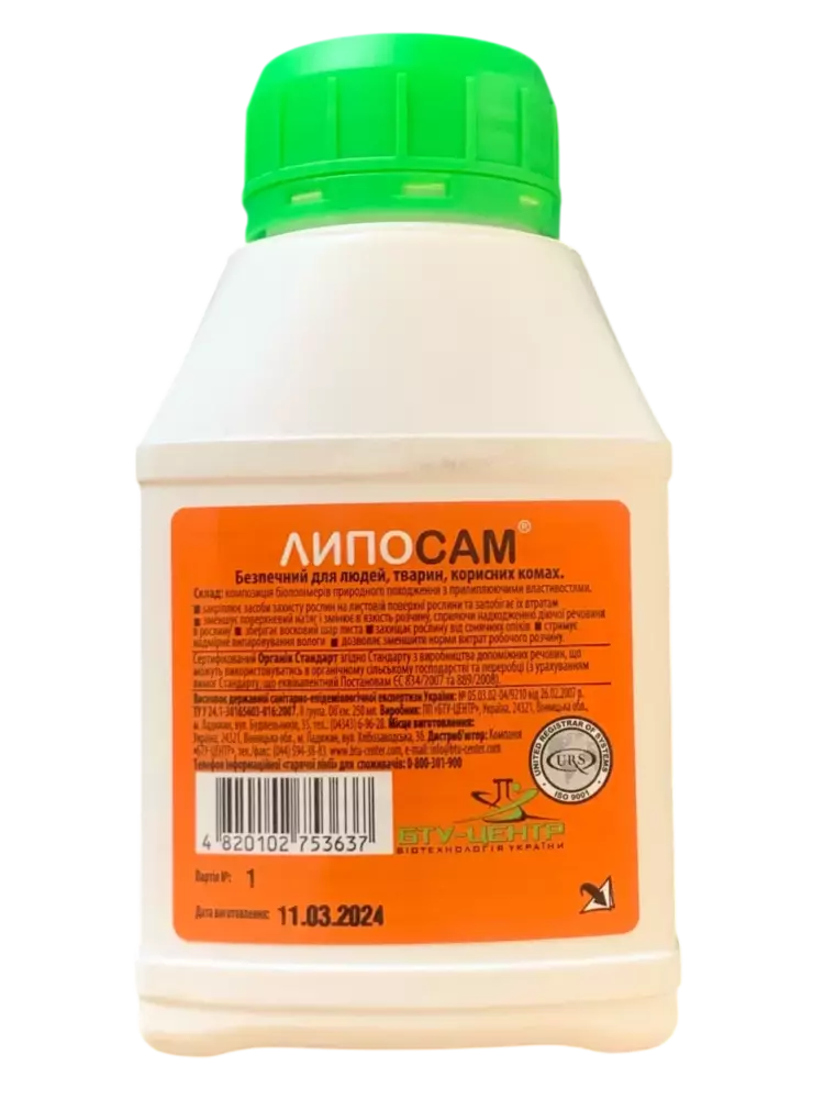 Ліпосом — екологічно безпечний натуральний засіб. Препарат ліпосам утворює сітчасту плівку на листі, коренях і плодах, що сприяє утриманню пестицидів і вологи на рослинах. Прилипач не перешкоджає диханню й фотосинтезу, оберігає рослини від сонячних опіків і посушливості, а плоди — від розтріскування. Склад — липкі натуральні полісахариди.