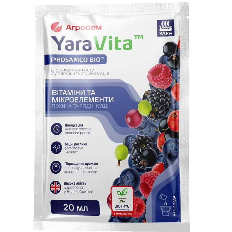 Біостимулятор росту для лохини, ягідних кущів YaraVita - це збалансована комбінація макро- та мікроелементів і біоактивних сполук, екстрагованих з унікальних водоростей Ascophyllum nodosum. Розроблений для подолання дефіциту елементів живлення, активації росту рослин, стійкості до негативних факторів середовища, стимуляції кореневої системи, інтенсивності цвітіння та запилення, збільшення кількості бутонів, наливання та збільшення крупності ягід, зменшує осипання зав’язі, збільшення якісних показників урожаю, а саме вітамінів, цукрів та смакових якостей.