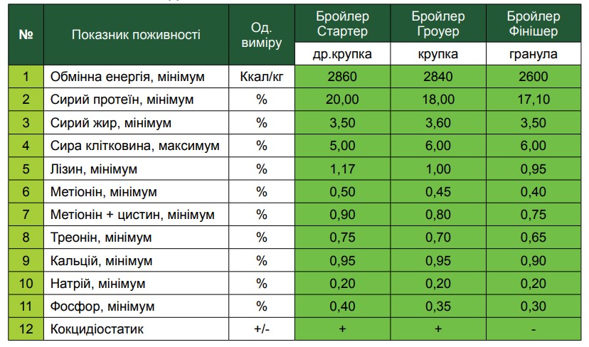 АСОРТИМЕНТ КОРМІВ ДЛЯ ВІДГОДІВЛІ КУРЕЙ-БРОЙЛЕРІВ