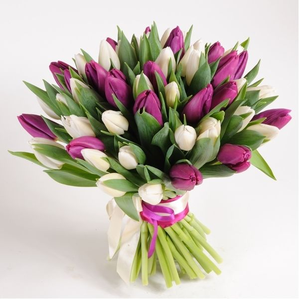 купить тюльпаны оптом КиевКрасивый букет из фиолетовых и белых тюльпанов Микс состоит из 51 цветка. Такой букет тюльпанов может стать идеальным подарком для любимой на День Святого Валентина или 8 Марта. Сделайте ей сюрприз и закажите букет тюльпанов с доставкой по Киеву и Киевской области.
