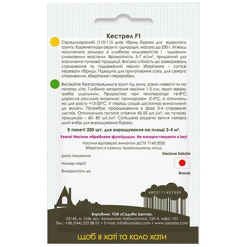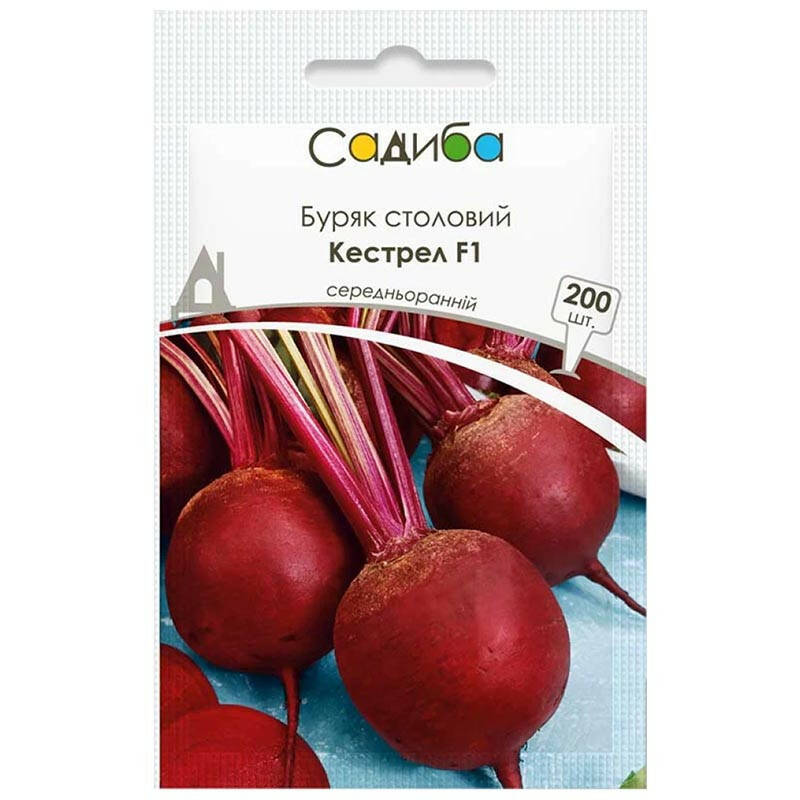 Буряк Кестрел F1 - середньоранній (110-115 днів) гібрид буряка для відкритого ґрунту. Коренеплоди округлі, однорідні, масою до 250 г. М'якуш насиченого кольору зі слабкою кільцеватістю і чудовими смаковими якостями. Врожайність 5-7 кг/м², придатний для отримання пучкової продукції.