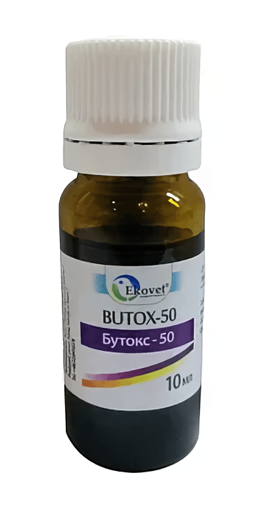 Обробка собак, кішок і хутрових звірів. Обробку тварин проводять, змочуючи шерсть і шкірний покрив на уражених місцях готовим робочим розчином Бутокса 50, або обробляють всю поверхню тіла. Довгошерсті породи тварин можна купати цілком. Також обробляють будиночок, підстилку або будку тварини. Перед використанням Бутокс 50 розчиняють в прохолодній водопровідній воді. Для обробки тварин від бліх, вошей, волосоїдів 1 дозу (1 мл) препарату розводять в 4 літрах води. При ураженні тварин іксодовими кліщами 1 дозу (1 мл) препарату розводять в 1,3 літрах води, повторну обробку, в сезон активності кліщів, проводять один раз на 6 – 7 днів. Для лікування корости необхідно обробити уражену ділянку з захопленням 1 – 2 см здорової шкіри, 1 дозу (1 мл) препарату розводять в 1 літрі води і змочують шерсть і шкірний покрив отриманим розчином. Повторну обробку проводять через 7 – 10 днів до отримання двох негативних зіскрібків шкіри. Перед використанням препарату тварину не можна мити за три дні до обробки, а також протягом трьох днів після обробки.