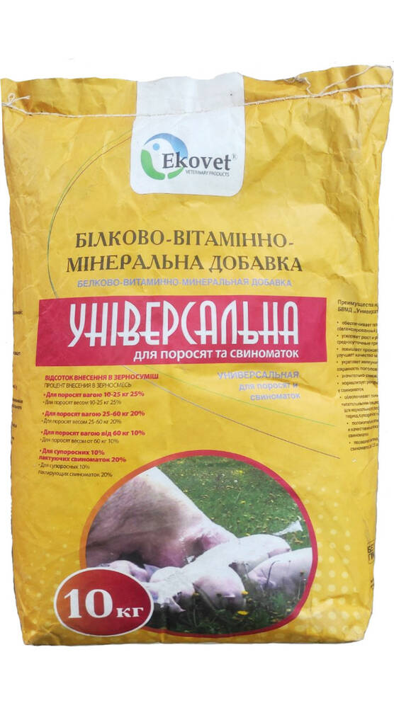 Застосовуючи БВМД "Універсал", Ви забезпечуєте тварин усіма необхідними поживними речовинами, вітамінами та мінералами, що гарантує максимальні результати у виробництві високоякісного м'яса. БВМД "Універсал" для свиней застосовують для приготування збалансованих повноцінних комбікормів в умовах підсобних та промислових господарств.
