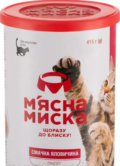 М'ясний паштет «М'ясна Миска» — це новий стандарт корму економкласу. Класична банка 415 г вологого корму для котів і собак набуває нової популярності завдяки зручній фірмовій кришці, що в комбінації зі спеціальним харчовим металом банки дає можливість зберігати корм у відкритому вигляді до 48 годин, за які ваш улюбленець точно з'їсть.