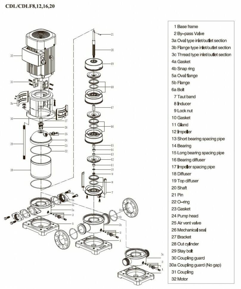 Насос CDLF являє собою вертикальний багатоступінчатий відцентровий насос зі стандартним електродвигуном. Вихідний вал двигуна напряму з’єднується з валом насоса через муфту. Всі гідравлічні компоненти виготовлені з нержавіючої сталі, що дозволяє використовувати даний тип насоса не тільки для перекачування води, а й інших рідин, що не чинять агресивну дію на нержавіючу сталь (наприклад, слабкі розчини лугів на кислот). Стандартний асинхронний двигун, котрим оснащений цей насос, дозволяє використовувати різноманітні системи захисту та керування для запобігання роботі насоса в режимі «сухий хід», обриву та перекосу фаз, перевантаження двигуна, а також використання частотних перетворювачів сумісно з даним типом двигунів.