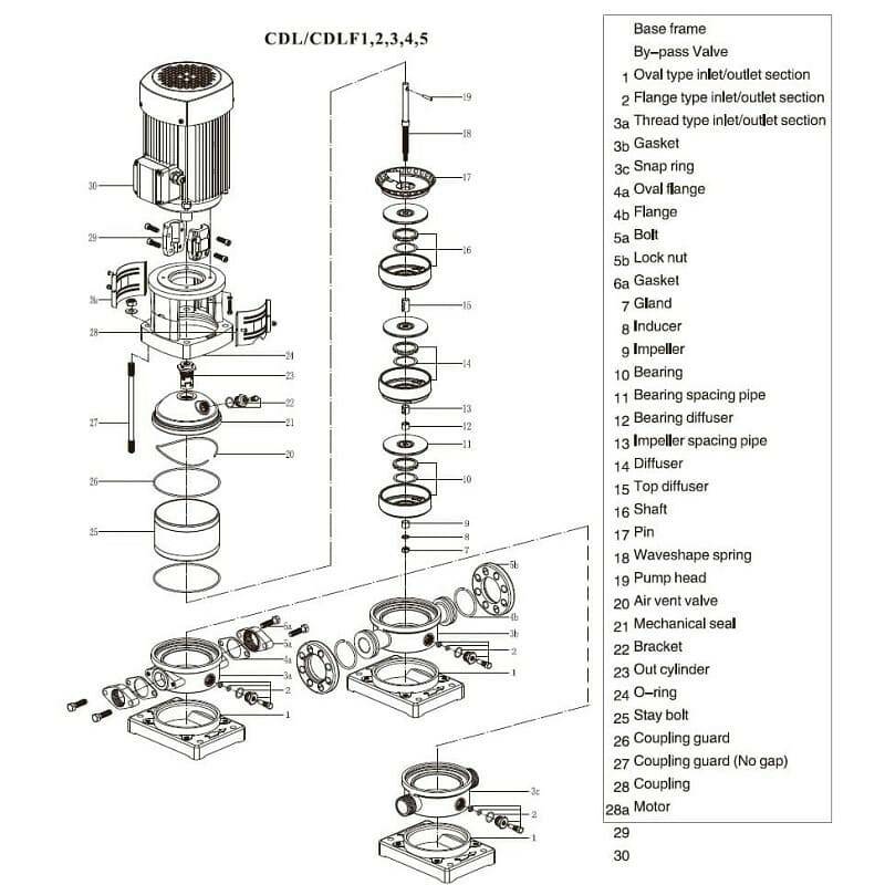 Застосування: насос спирту, насос спиртовмісних рідин, насос на БРУ, насос для ректифікації, насос розчинника, насос для добавок, насос хімічний EX, насос для палива, насос для КАС, насос для хімії, насос харчовий, насос EX, насос спиртовий, насос для вибухонебезпечних рідин, насос для приміщень вибухонебезпечних. Насос CDLF являє собою вертикальний багатоступінчатий відцентровий насос зі стандартним електродвигуном. Вихідний вал двигуна напряму з’єднується з валом насоса через муфту. Всі гідравлічні компоненти виготовлені з нержавіючої сталі, що дозволяє використовувати даний тип насоса не тільки для перекачування води, а й інших рідин, що не чинять агресивну дію на нержавіючу сталь (наприклад, слабкі розчини лугів на кислот). Стандартний асинхронний двигун, котрим оснащений цей насос, дозволяє використовувати різноманітні системи захисту та керування для запобігання роботі насоса в режимі «сухий хід», обриву та перекосу фаз, перевантаження двигуна, а також використання частотних перетворювачів сумісно з даним типом двигунів.
