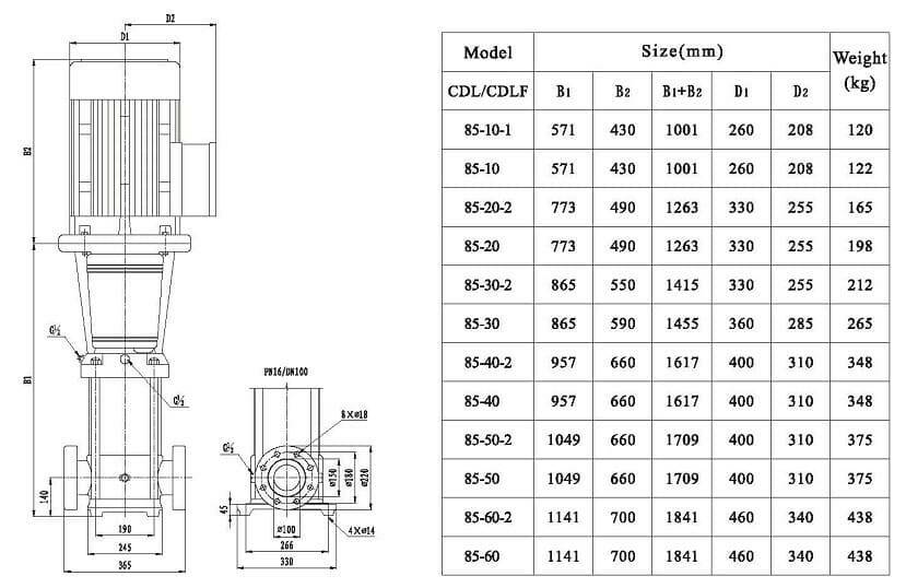 Насос CDLF являє собою вертикальний багатоступінчатий відцентровий насос зі стандартним електродвигуном. Вихідний вал двигуна напряму з’єднується з валом насоса через муфту. Всі гідравлічні компоненти виготовлені з нержавіючої сталі, що дозволяє використовувати даний тип насоса не тільки для перекачування води, а й інших рідин, що не чинять агресивну дію на нержавіючу сталь (наприклад, слабкі розчини лугів на кислот). Стандартний асинхронний двигун, котрим оснащений цей насос, дозволяє використовувати різноманітні системи захисту та керування для запобігання роботі насоса в режимі «сухий хід», обриву та перекосу фаз, перевантаження двигуна, а також використання частотних перетворювачів сумісно з даним типом двигунів.