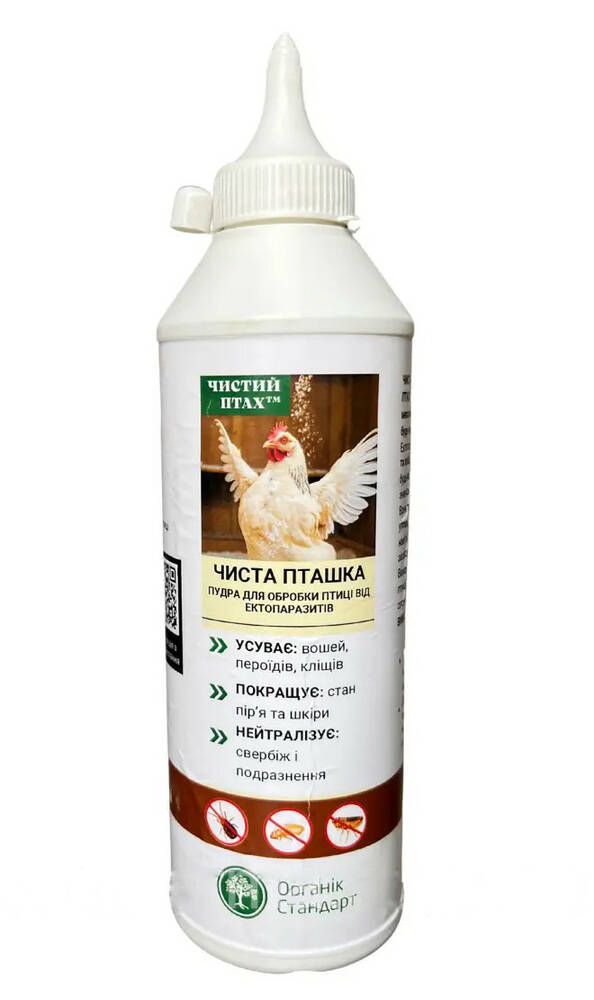 Чиста пташка – це натуральна пудра для ефективного захисту курей та інших свійських птахів від ектопаразитів (вошей, кліщів, пероїдів та бліх).