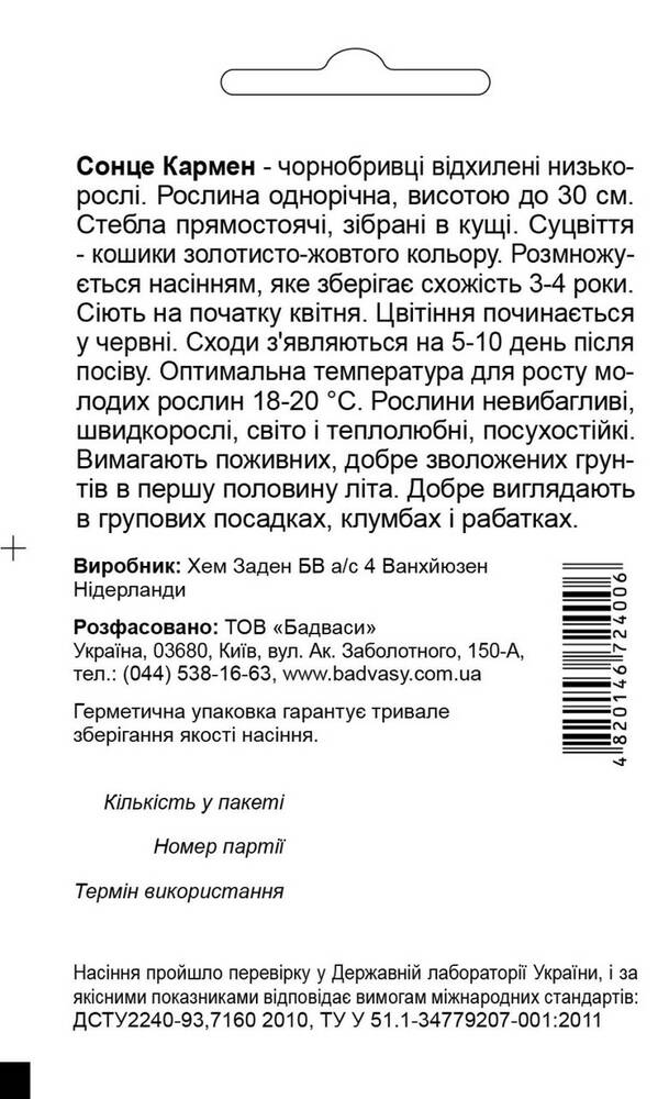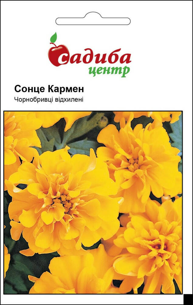 Чорнобривці Сонце Кармен - чорнобривці розлогі низькорослі. Рослина однорічна, висотою до 30 см. Стебла прямостоячі, зібрані в кущі. Суцвіття - кошики золотисто-жовтого кольору. Розмножується насінням, яке зберігає схожість 3-4 роки. Сіють на початку квітня. Цвітіння починається у червні. Сходи з'являються на 5-10 день після посіву. Оптимальна температура для росту молодих рослин 18-20 °С. Рослини невибагливі, швидкорослі, світо і теплолюбні, посухостійкі. Вимагають поживних, добре зволожених грунтів в першу половину літа. Добре виглядають в групових посадках, клумбах і рабатках.