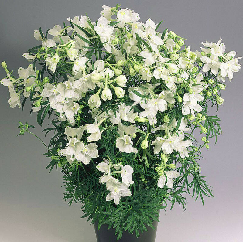 Дельфініум Батерфляй – трав’янистий багаторічник. Формує міцні прямостоячі стебла висотою 40 см. Квіти великі, білого кольору, 3,5-4 см у діаметрі, зібрані у кисті. Насіння сіють у квітні на розсаду, злегка присипають грунтом. Накривають склом чи поліетиленом і регулярно поливають. Після появи сходів скло знімають. У відкритий грунт рослини висаджують в травні, дорощують до осені чи весни наступного року і висаджують на постійне місце на відстані 30-40 см. Якщо висіяти насіння у відкритий грунт у квітні-травні, то цвітіння настає на другий рік. Морозостійка, посухостійка рослина. Використовують для створення змішаних груп, рабаток, в міксбордерах і для зрізу.