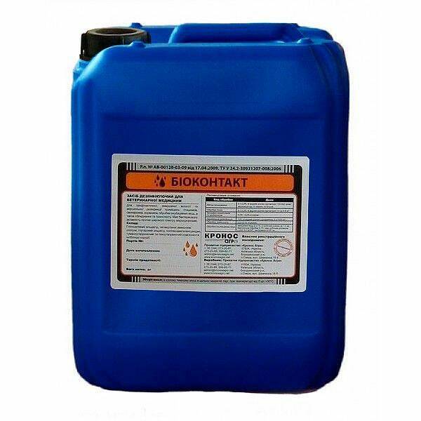 Препарат "Біоконтакт" - дезінфікуюча рідина жовто-коричневого кольору, що має широкий діапазон дії. Призначений для здійснення профілактичної та осередкової дезінфекції приміщень для птахівництва і тваринництва, обладнання, для обробки інкубаційних яєць, для використання в дезбар'єрах і дезкилимках, для знезараження транспорту і багатьох інших об'єктів, які підлягають ветеринарному контролю. Підходить для обробки методом вологого розпилення та аерозольної дезінфекції, для протирання поверхонь і оброблення піною, а також методом зрошення.