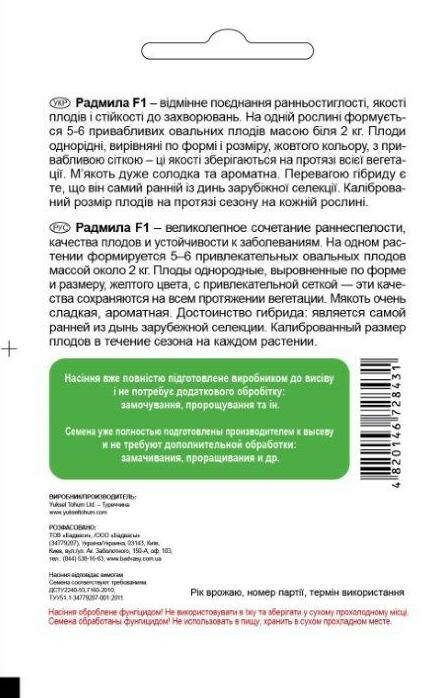 Відмінне поєднання ранньостиглості, якості плодів і стійкості до захворювань. На одній рослині формується 5-6 привабливих овальних плодів масою біля 2 кг. Плоди однорідні, вирівняні по формі і розміру, жовтого кольору, з привабливою сіткою – ці якості зберігаються на протязі всієї вегетації. М’якоть дуже солодка та ароматна. Перевагою гібриду є те, що він самий ранній із динь зарубіжної селекції. Калібрований розмір плодів на протязі сезону на кожній рослині.