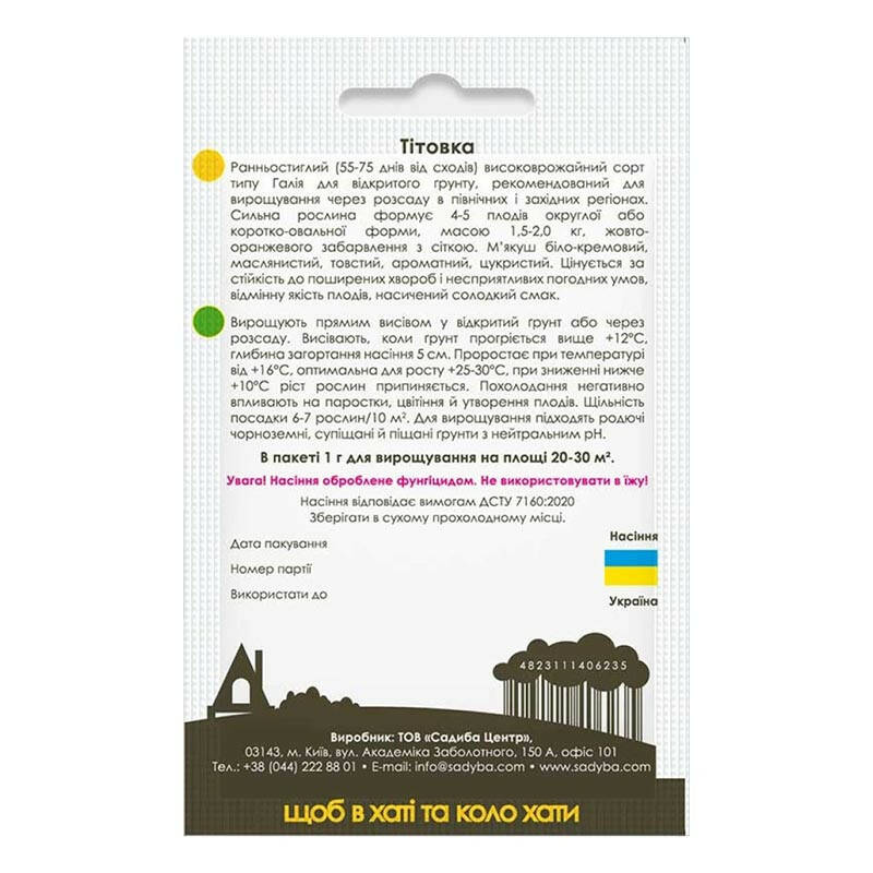 Тітовка - відзначається високими товарними та смаковими якостями. Плоди округлі або коротко - овальні із сіткою, жовто - оранжевого кольору. М'якоть товста, масляниста, солодка. Високоврожайна. Стійка до основних хвороб баштанних культур. Для споживання у свіжому вигляді. 1