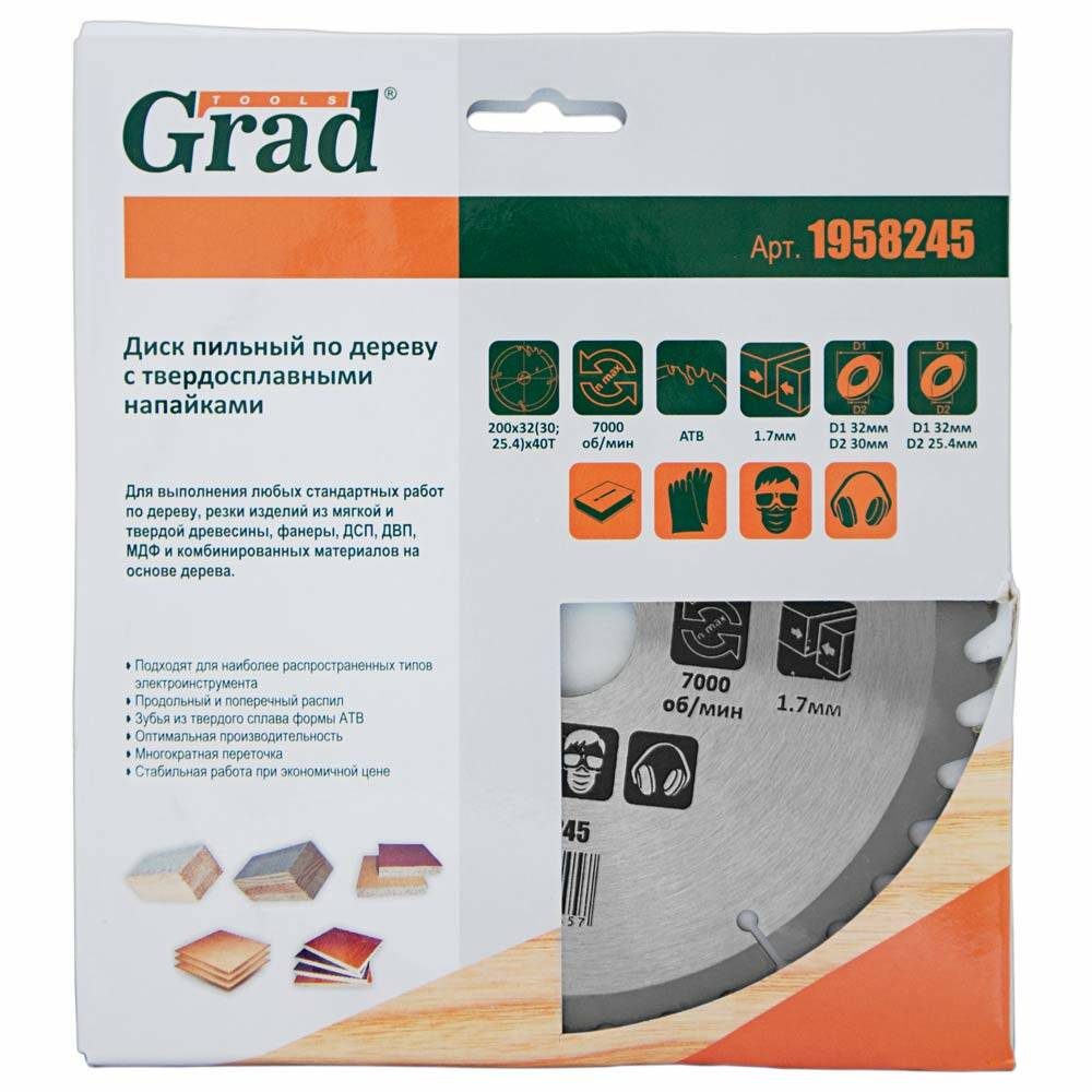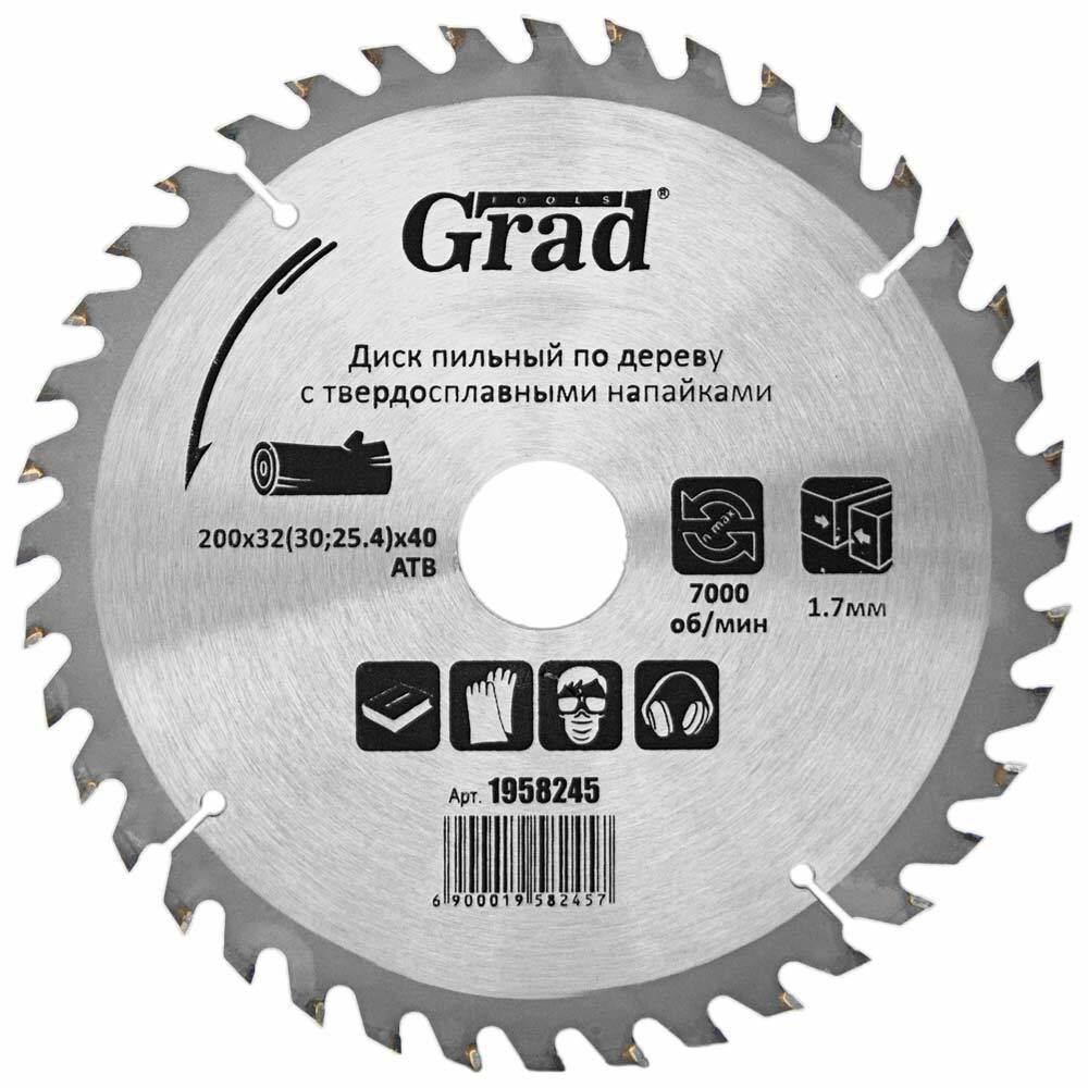 Диск пиляльний по дереву з твердосплавними напайками Ø200×32 (30; 25.4)×40Т, 7000об/хв GRAD (1958245)