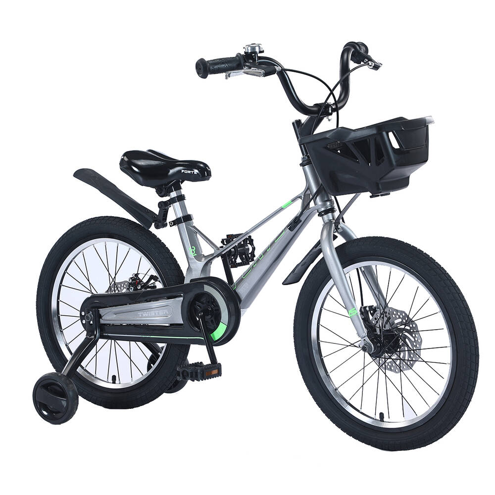 Опис Велосипед Forte TWISTER 16" сіро-зелений Дитячий велосипед   TWISTER  - Зручна і красива новинка від Forte. Рама велосипеда виконана з легкого та якісного алюмінію, кермо із міцної сталі. Відрізняється стильним дизайном та комфортом в експлуатації. Колеса 16" розміру з переднім гальмом. Модель підходить для навчання та практики дітей їзді, тому, що оснащена додатковими маленькими знімними колесами. На цьому велосипеді дитина весело і безпечно зможе здійснювати свої перші поїздки.