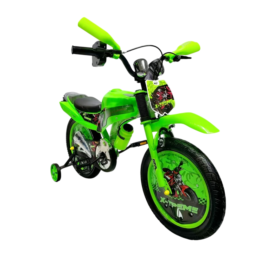 Опис Дитячий велосипед X-Treme  RIDER 25.16-03 к16 сталь зелений Дитячий велосипед   RIDER – зручна та красива новинка від X-Treme. Рама велосипеда виконана з якісної сталі, відрізняється стильним дизайном під мотоцикл та комфортом в експлуатації. Колеса 16" розміру. Модель підходить для навчання та практики дітей їзді, тому, що оснащена додатковими маленькими знімними колесами. На цьому велосипеді дитина весело та безпечно зможе здійснювати свої перші поїздки.