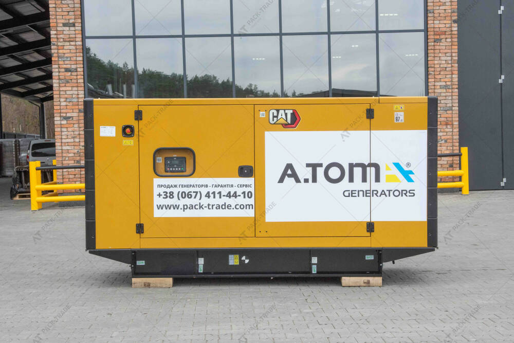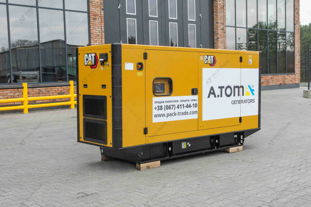 Дизельний генератор CAT DE165E0 132/120 кВт. Максимальна потужність – 132 кВт. Витрати палива при 100% навантаженні – 32,4 л/год. Об'єм паливного баку – 349 л.