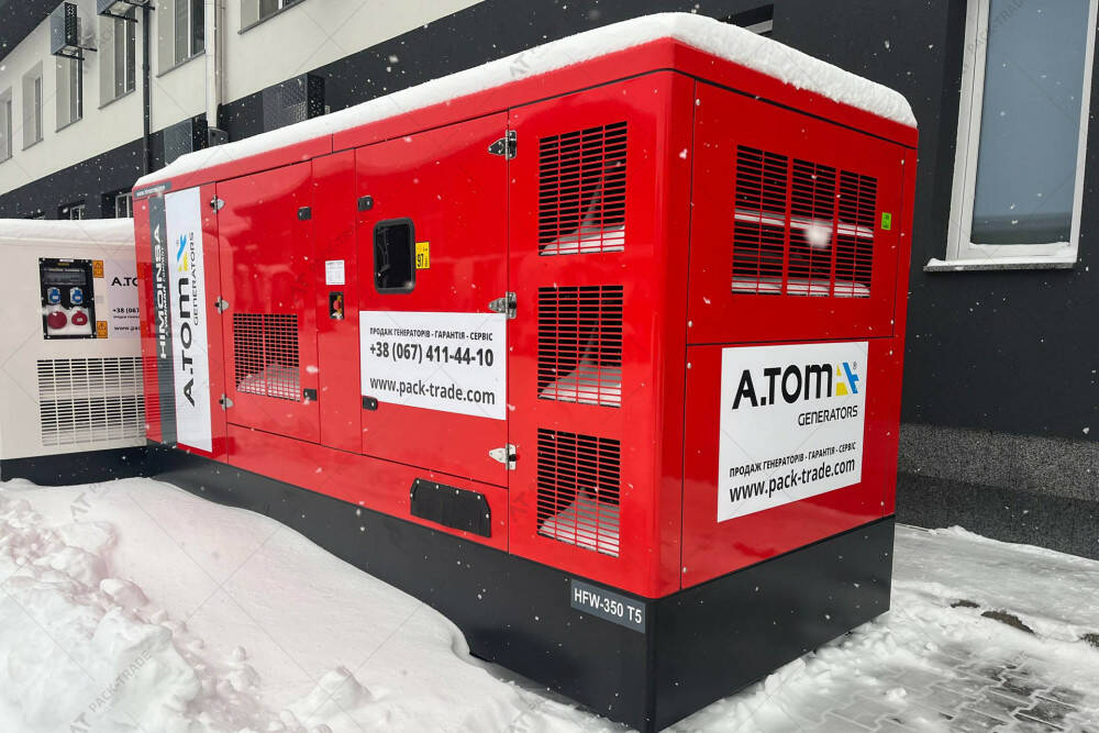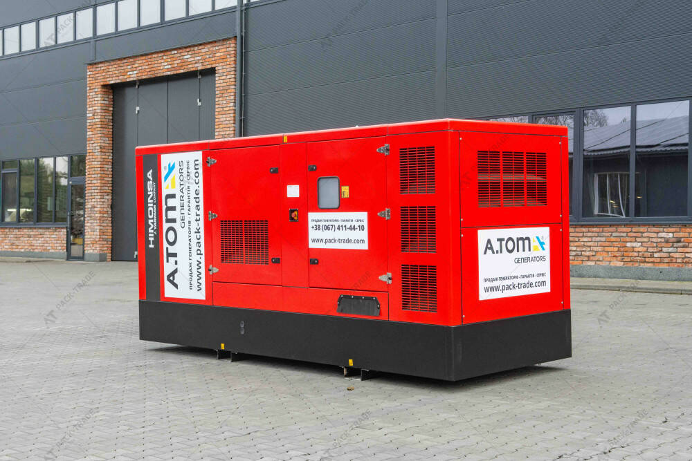 Дизельний генератор HIMOINSA HFW-350 T5 332/288 кВт. Максимальна потужність – 332 кВт. Витрати палива при 100% навантаженні – 88,14 л/год. Об'єм паливного бака – 597 л.