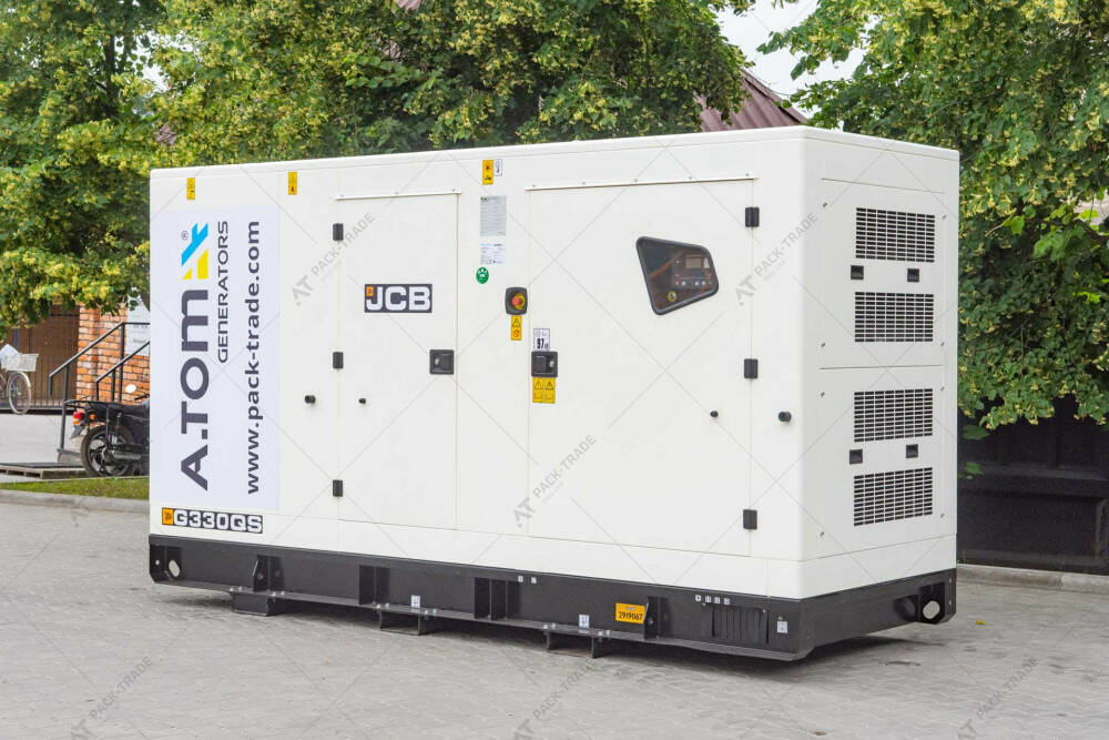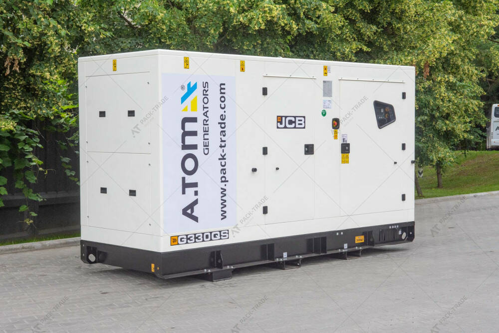Дизельний генератор JCB G330QS 264 кВт. Максимальна потужність 264 кВт. Витрати палива при 100% навантаженні 63.3 л/год. Об'єм паливного баку 470 л