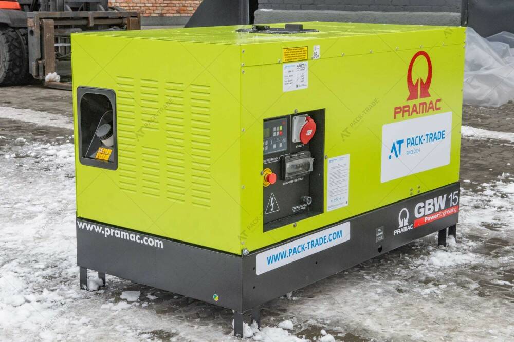 Дизельний генератор PRAMAC GBW15Y 10.76 кВт. Максимальна потужність 10.76 кВт. Витрати палива при 100% навантаженні 3.32 л/год. Об'єм паливного баку 51 л