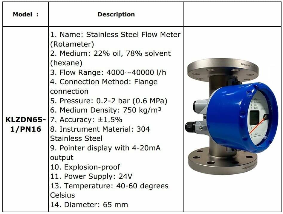 DN65 Витратомір (ротаметр) з нержавіючої сталі KLZDN65-1/PN16 (22% олія, 78% розчинник(гексан) 750 кг/м3, 40-60°C) 4000~40000 l/h, 4-20mA, Ex