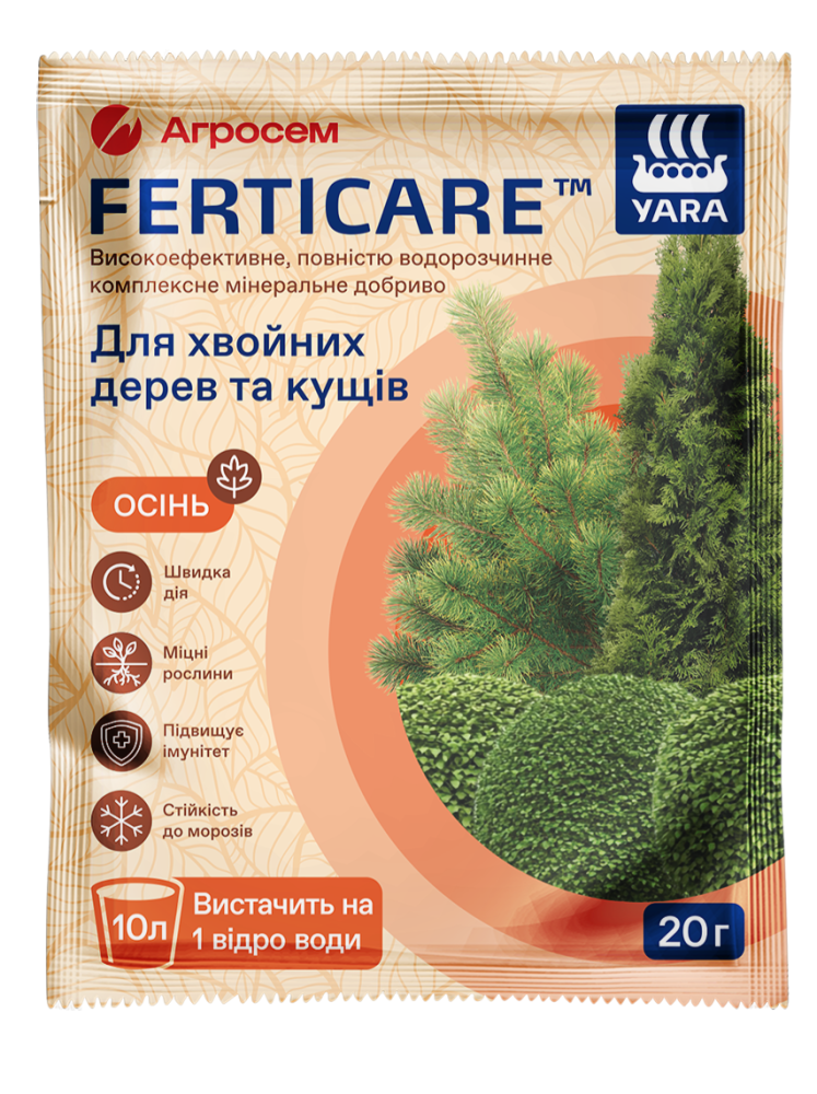 Добриво для хвойних дерев та кущів Осінь Yara Ferticare - входять самі необхідні елементи живлення, які позитивно впливають на захист кореневої системи в період похолодань, захищають від пожовтіння, підвищують стійкість до стресових умов, загартовують рослини під час стресів покращуючи їх перезимівлю.