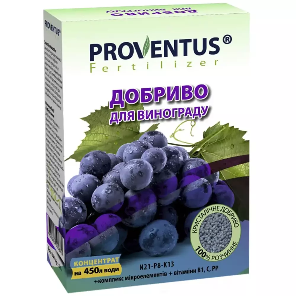Концентроване мінеральне добриво Proventus, збагачене комплексом макро- та мікроелементів у хелатній формі, застосовується для повноцінного підживлення винограду з метою збільшення вмісту поживних елементів у ягодах та стимулювання процесів росту, розвитку і врожайності культур. У складі поживної суміші містяться макроелементи: азот (N) – 21%; фосфор (P2О5) - 8%, калій (K2О) - 13%; мезоелементи: сірка (S) - 24 г/кг, магній (MgO) - 3 г/кг; мікроелементи: бор (В) - 0.31 г/кг, залізо (Fe) - 1.6 г/кг, марганець (Мn) - 0.34 г/кг, цинк (Zn) - 0.32 г/кг, мідь (Cu) - 0.23 г/ кг, молібден (Мо) - 0.03 г/кг, кобальт (С) - 0.02 г/кг; вітамінний комплекс: тіамін (В1) – 110 мг/кг, аскорбінова кислота (С) – 520 мг/кг; нікотинова кислота (РР) – 210 мг/кг. Збалансований склад добрива Провентус містить усі необхідні для живлення елементи в оптимальному співвідношенні та легкодоступній для рослин формі. Завдяки цьому засіб підвищує врожайність та вміст корисних компонентів у ягодах (вітамінів, фруктози, пектину та інших), зміцнює імунітет рослин та усуває видимі прояви дефіциту елементів живлення. Завдяки збалансованому складу добрива, рослина формує рівномірні грони більшого розміру. Крім цього, мінеральне підживлення Провентус знижує кількість нітратів у ягодах, підвищує родючість грунту і відмінно поєднується з органічними добривами.