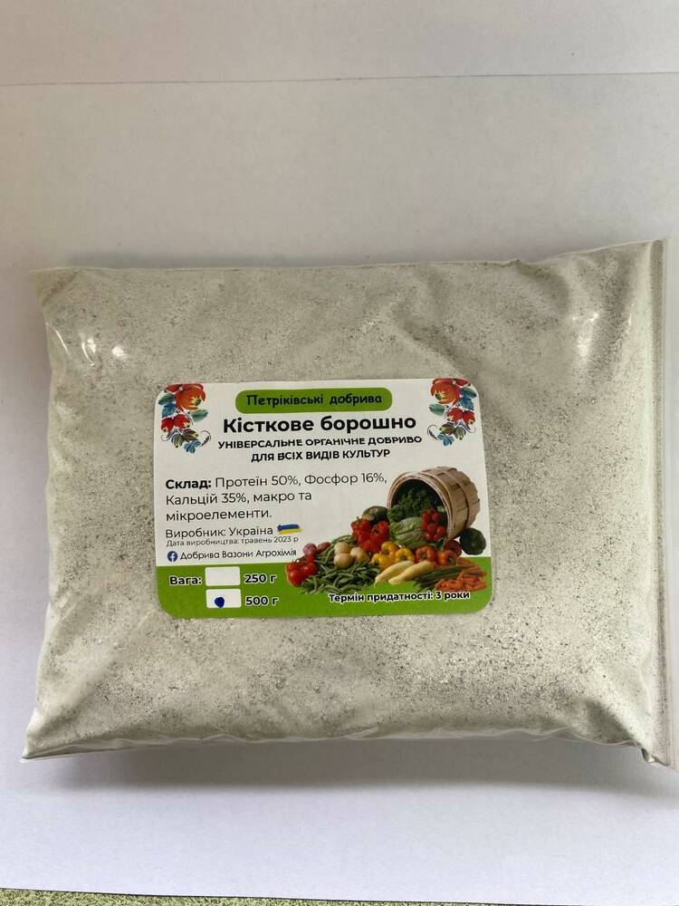 Кісткове борошно - це продукт переробки відходів тваринницької промисловості. Органічні добрива з кісткового борошна застосовують у сільському господарстві там, де потрібно додатково вносити кальцій зниження кислотності. Підходять для всіх садових та кімнатних декоративних культур. Це екологічно чисте нешкідливе добриво тривалої дії, що переходить до складу ґрунту в період від 6 до 8 місяців.