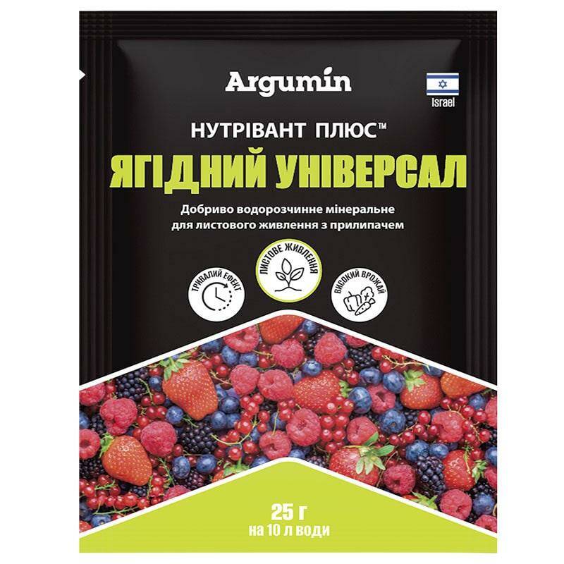 Добриво Нутрівант Плюс Ягідний універсал водорозчинне, мінеральне з прилипачем, призначене для листового (позакореневого) підживлення ягідних культур в ключові фази розвитку. Завдяки своєму збалансованому складу макро- та мікроелементів легко засвоюється рослиною, активізує ріст і повноцінний розвиток рослин. Добриво сприяє зав'язуванню, зростанню та дозріванню ягід. За рахунок екологічного прилипача Fertivant не змивається опадами з листкової поверхні.