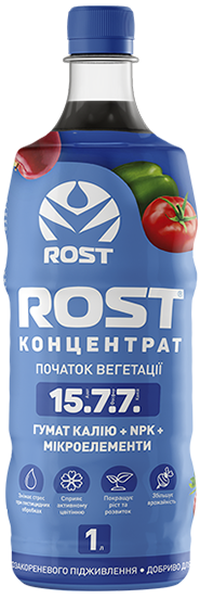 ROST Концентрат - концентрированное органо-минеральное удобрение на основе гумата калия, содержащее комплекс макро- и микроэлементов. Удобрение обеспечивает растения необходимыми элементами питания; мобилизует иммунную систему растений; улучшает синтез сахаров, аминокислот, витаминов в растении; усиливает поглощение воды и кислорода, что в результате ускоряет деление клеток; интенсифицирует обменные процессы; повышает поступление питательных элементов в растение; ускоряет синтез нуклеиновых кислот и белка; активирует белковый и углеводный обмен веществ; увеличивает проницаемость клеточной мембраны; облегчает транспортировку питательных веществ внутрь клетки.