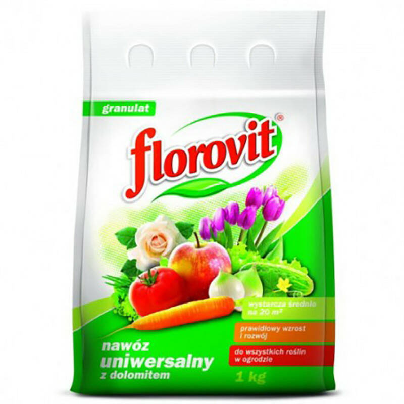 Флоровіт універсальний - добриво з доломітом N: P: К-11,4: 9,2: 16,8. До складу також входить: сірка, магній, бор, мідь, молібден. Добриво містить набір поживних компонентів у відповідних пропорціях, необхідних для правильного росту і розвитку ряду груп рослин. Використання добрива гарантує отримання повноцінних плодів і чудовий зовнішній вигляд квітів, декоративних дерев і чагарників. Переваги використання добрива: - забезпечує рівномірне зростання і розвиток рослин, а також покращує цвітіння і плодоношення. - містить повний набір поживних компонентів, а також доломіт, завдяки чому виявляє легку окисляє дію.