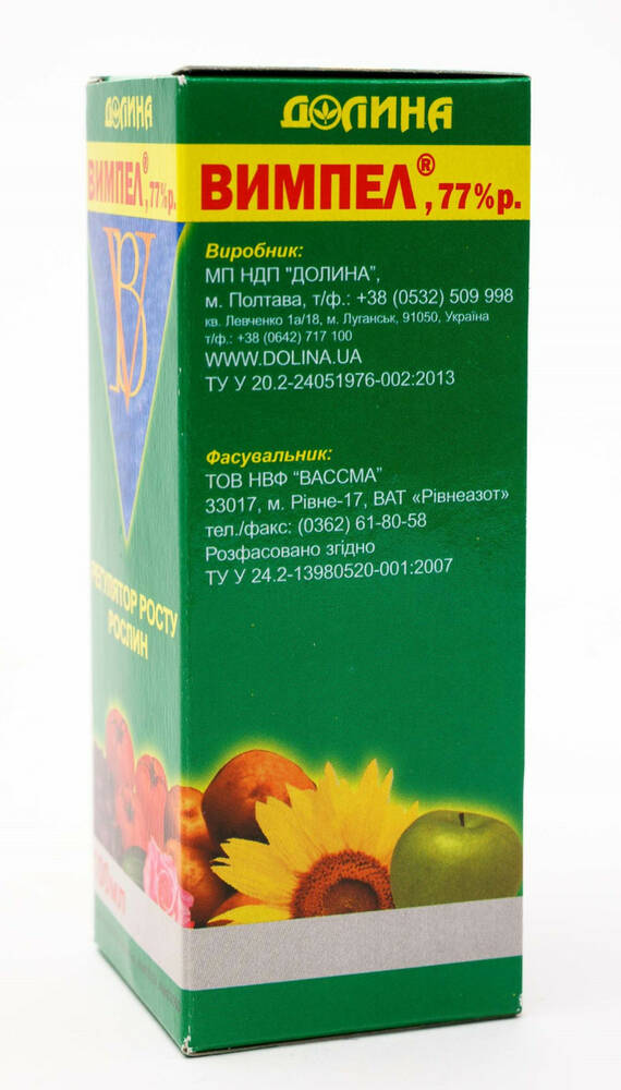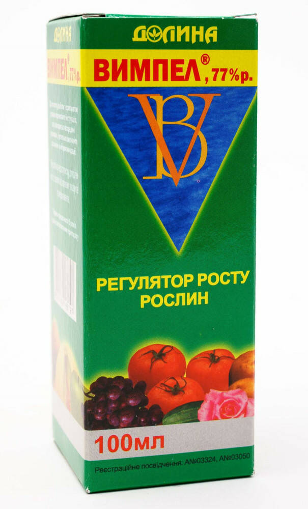 Регулятор росту Вимпел - покращує ріст і розвиток рослин, ступінь приживлюваності, сприяє активному розвитку кореневої системи, що збільшує урожай на 10-30%. Вимпел має яскраво виражений ефект прилипача, стимулює процес проростання насіння, захищає насіння при їх довготривалому перебуванні в несприятливих умовах, підвищує польову схожість насіння, сприяє активному розвитку кореневої системи, що особливо необхідно в осінній період розвитку рослини. Покращує транспортабельність, товарний вигляд плодів, ягід та овочів.